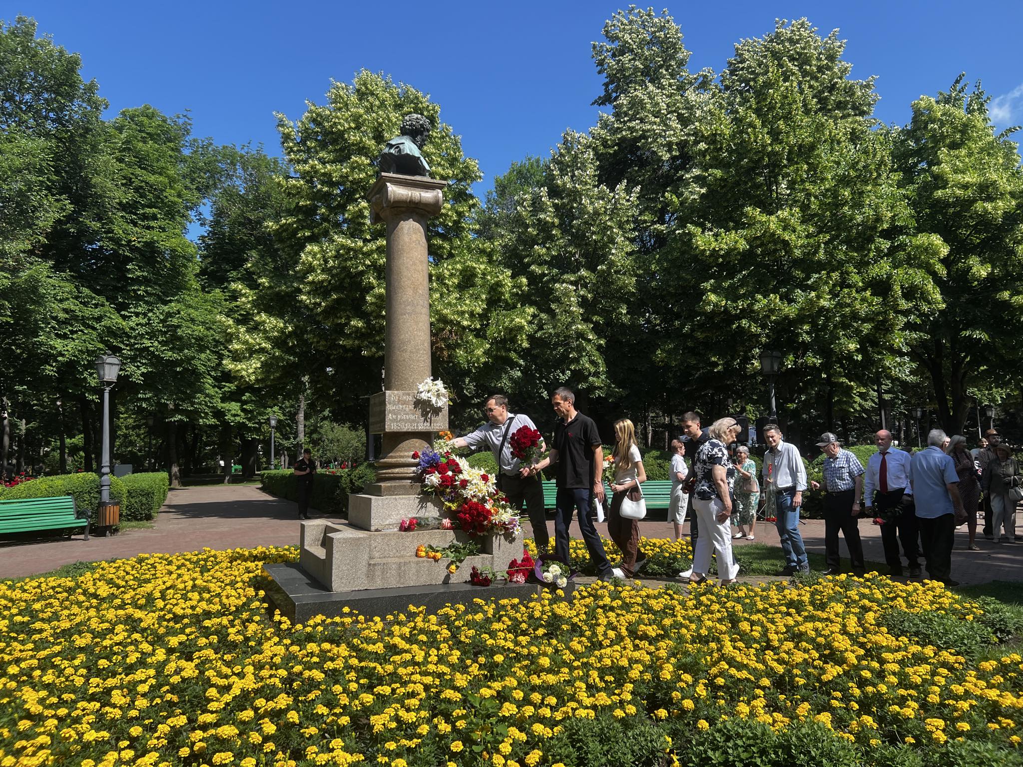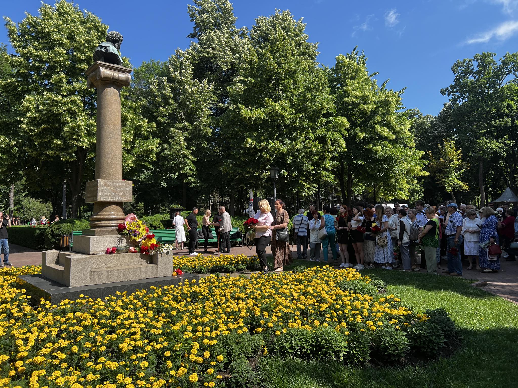 Люди, пришедшие на праздник возложили цветы к памятнику поэта, отдавая не только дань памяти и почитания, но и частичку собственных сердец. Клумба с живыми цветами у памятника Пушкину, живые цветы у подножия памятника, как символ вечно живых творений поэта, как символ разумного, доброго, вечного, посеянного им на века, дающего всходы и опору для многих людей творчества и многих почитателей его таланта, его мировоззрения, его философии добра и любви.