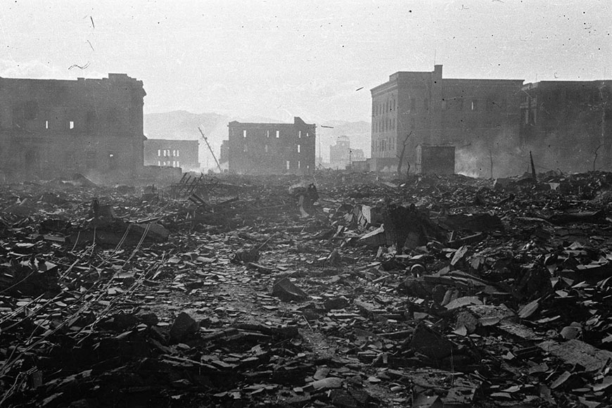Через сутки после бомбардировки город все еще находился в дыму. Август 1945 года