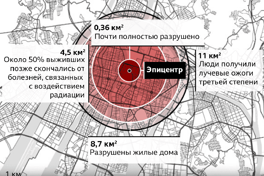 В момент взрыва, по разным оценкам, погибли от 70 до 100 тыс. человек. Однако это было только начало. В последующие годы десятки тысяч умерли от лучевой болезни. Общее число жертв на сегодня составляет около 300 тыс. человек.