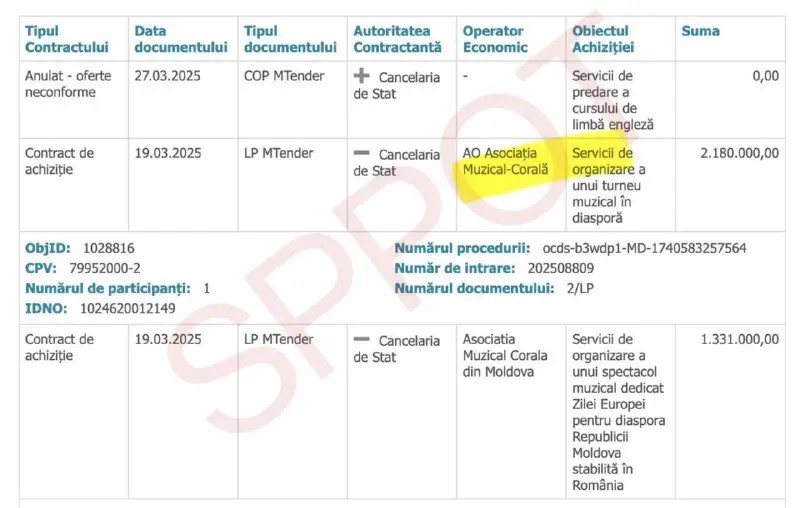 Средства выделены по упрощённой процедуре с одним участником. Цель — организация музыкального тура «Молдова – наша семья» для диаспоры и шоу ко Дню Европы.