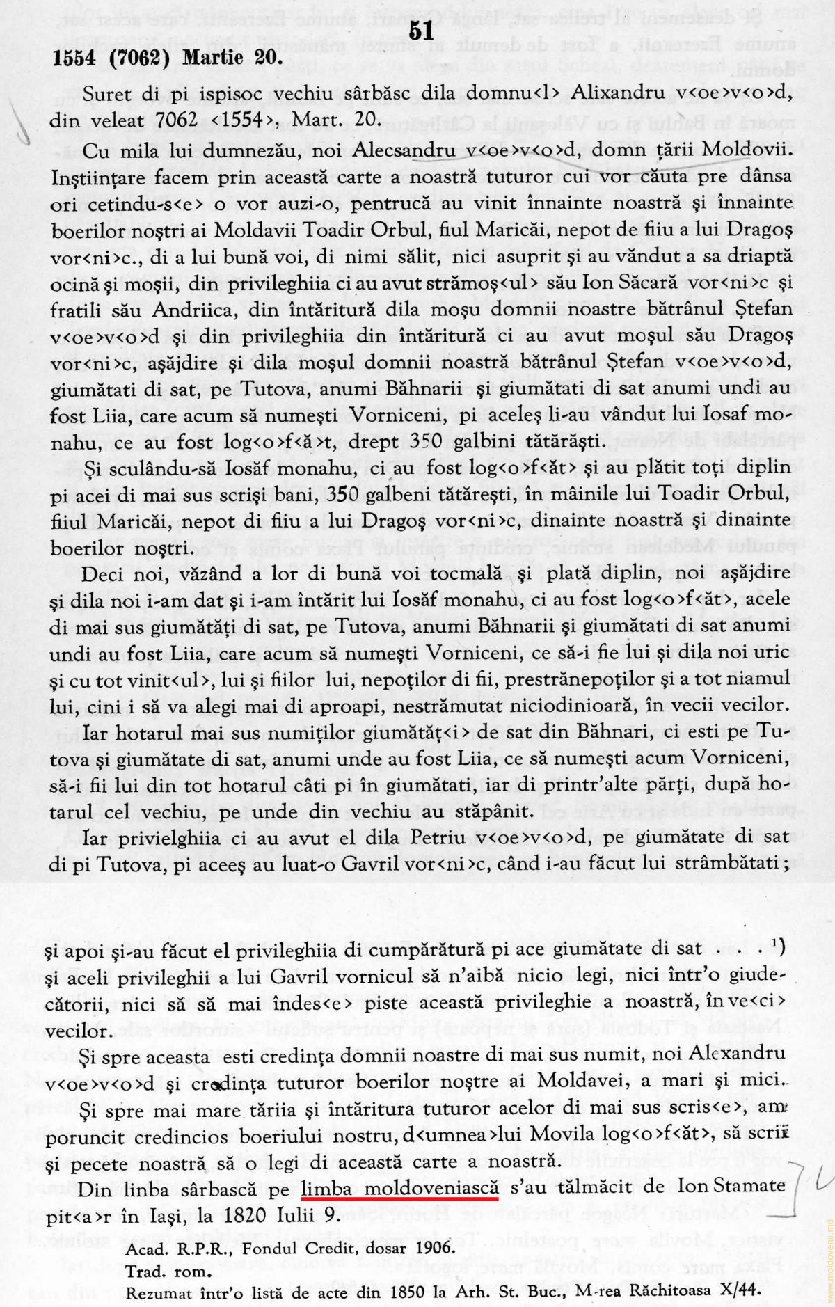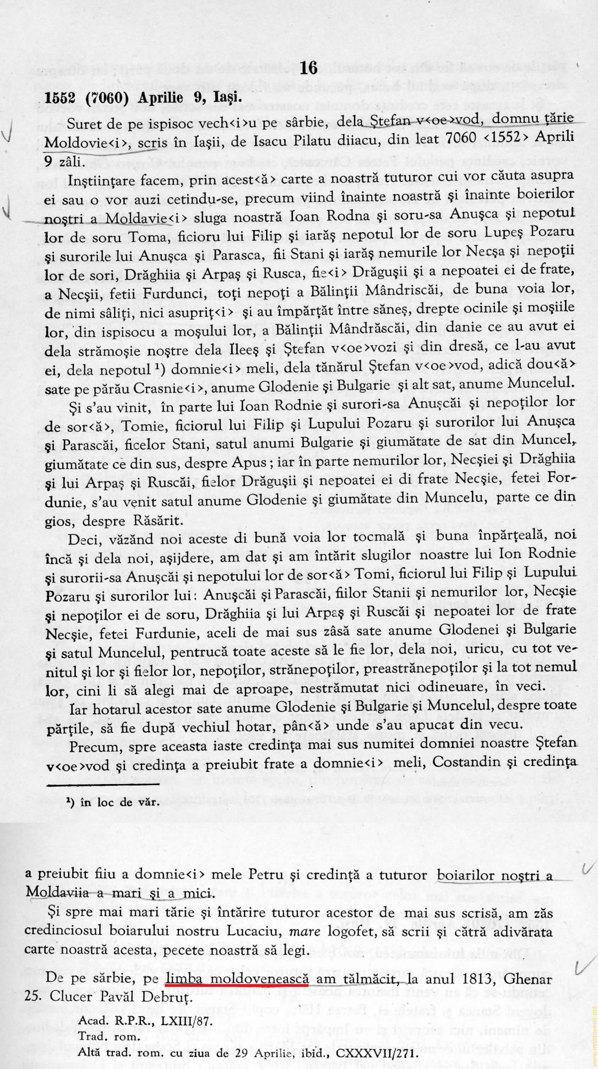 В частности, документы господарской канцелярии, в которых упоминается молдавский язык, были изданы Румынской академией в 1915 году.