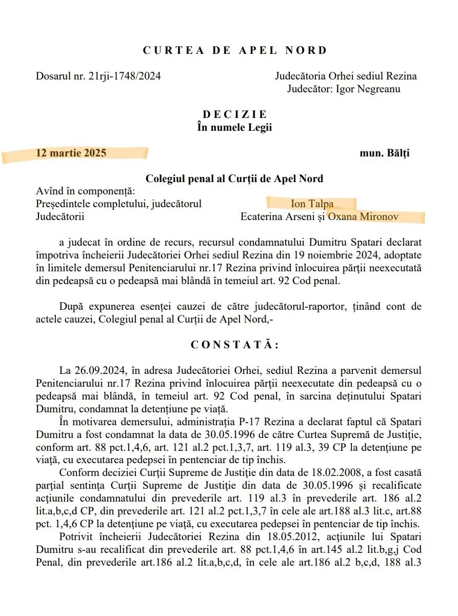 Коллеги из Observatorul публикуют судебное решение, из которого следует: вместе с подельниками Думитру Спэтарь ворвался в квартиру знакомого, бил, пытал и задушил двух мальчиков 10 и 8 лет. Затем из квартиры вынесли вещи на 4923 лея.